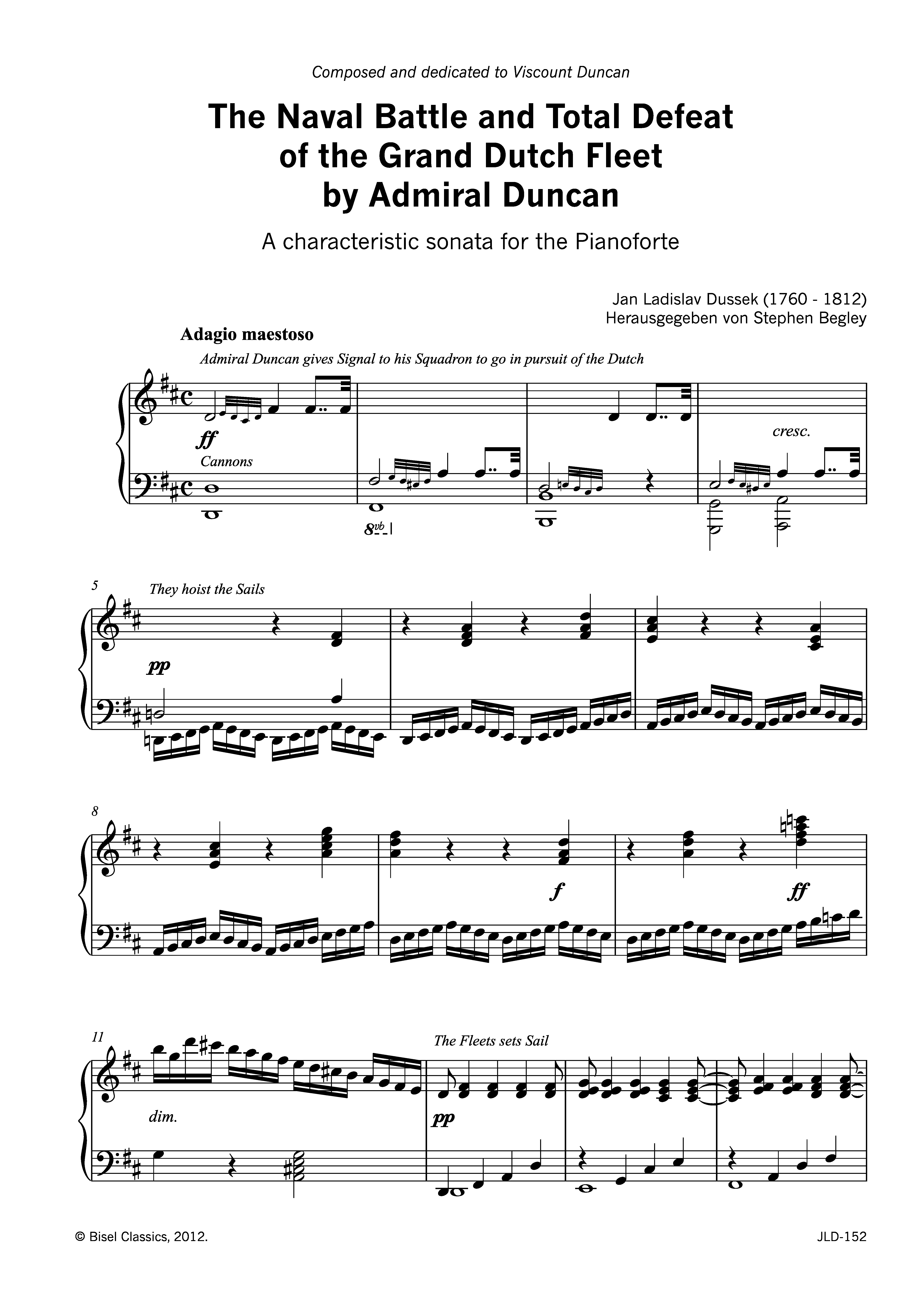 Considered a Romantic ahead of his time, the works of Dussek are a worthy addition to the piano repertoire and this piece, a characteristic sonata which commemorates the great naval battle of Camperdown is a moderately difficult work which successfully paints a colourful picture of the fray. Paraphrasing Rule Britannia, it is both a remembrance of glories past and an undying tribute to a true patriot and hero of the conflict, Admiral Adam Duncan.