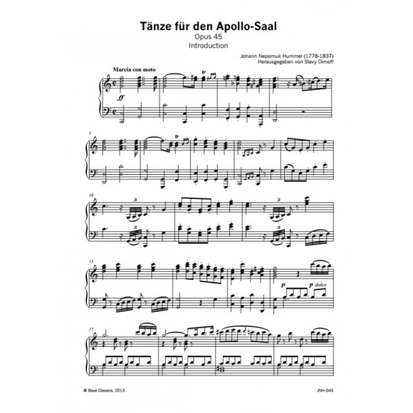 With his Op. 45 Hummel composed another series of dances in the year 1812 that he dedicated to the Apollosaal, the most fascinating amusement hall of Old Vienna, and a popular venue for the enlightened nobility just as for the emerging bourgeoisie. The composition includes six Minuets and six German Dances followed by Trios. The Introduction in the style of a brisk march and the large style Coda offer stylistic surprises. These enjoyable musical miniatures offer an interesting glimpse into the creation history of the classical waltz and the world famous Viennese dance culture. They retain their charm as dance music to the present day.