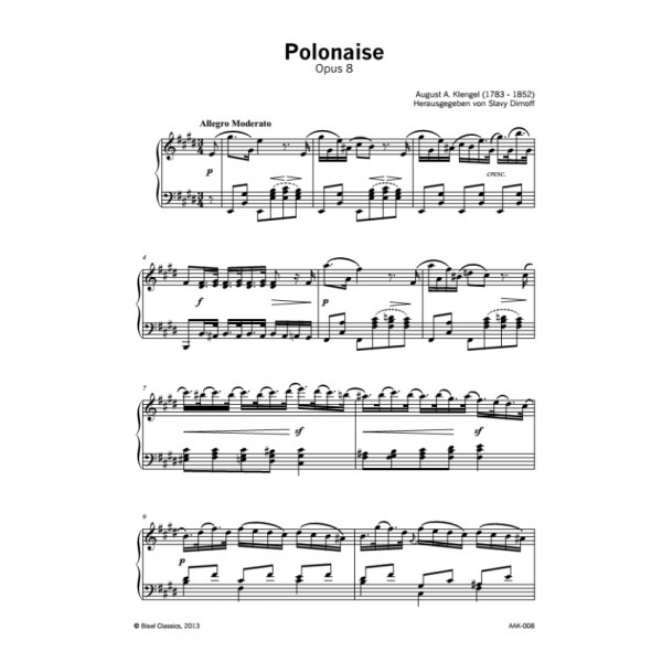 Because of their subtle, multifaceted and stylistically flawless elegance, his contemporaries esteemed the works of Klengel as a benchmark. The talented piano virtuoso greatly admired the works of Joh. Seb. Bach, and his lifes work was a monument to his idol. Throughout his entire life he was a servant to music and quietly accomplished great things, not as an imitator, but as an empathetic composer employing his own unique style. The present edition of the Polonaise, an early work from his days in Paris, discloses a sparkling gemstone of virtuoso romantic piano literature.