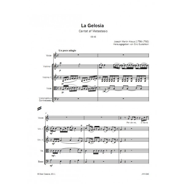 This cantata, composed in 1780, is the third in a set of four secular cantatas appearing between 1778 and 1780. Composed in Stockhom, this cantata was written for Lovisa Augusti, lead singer of the Stockholm Royal Theatre of which Kraus was Kapellmäster. No dedication is evidenced in the source material for this edition, the 1801 copy by Frederik Samuel Silverstolpe. Set to a text by Metastasio, Kraus imaginatively explores the musical rendition of the passions of jealousy and madness. Kraus mastery of musical and literary composition is united here in a brilliant and elevated work of musical drama.