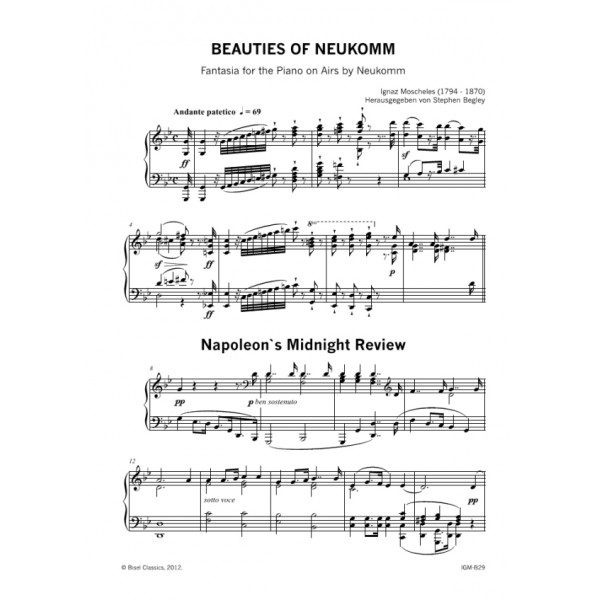 Charming and delightful are just two of the adjectives used to describe this Fantasia from the Czech pianist and composer, a true representative of the generation between the Classical and Romantic eras. In adapting Neukomms Midnight Review and The Sea for piano, Moscheles set himself the task of capturing some of the brilliance of the former and in doing so, he succeeded in creating an original work of enduring beauty.