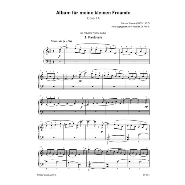 Composer, organist, conductor and pedagogue, Gabriel Pierné achieved success in every compositional style, and championed many important seminal performances of his contemporaries under his conductors baton. The Album für meine kleinen Freunde is a charming set of six little pieces, each one with a characteristic style and of modest difficulty. At home in the salon or concert hall here is a work as suitable for the beginner as for the experienced pianist. The album contains many memorable melodies and is destined to be a work enjoyed by both the performer and audiences alike.