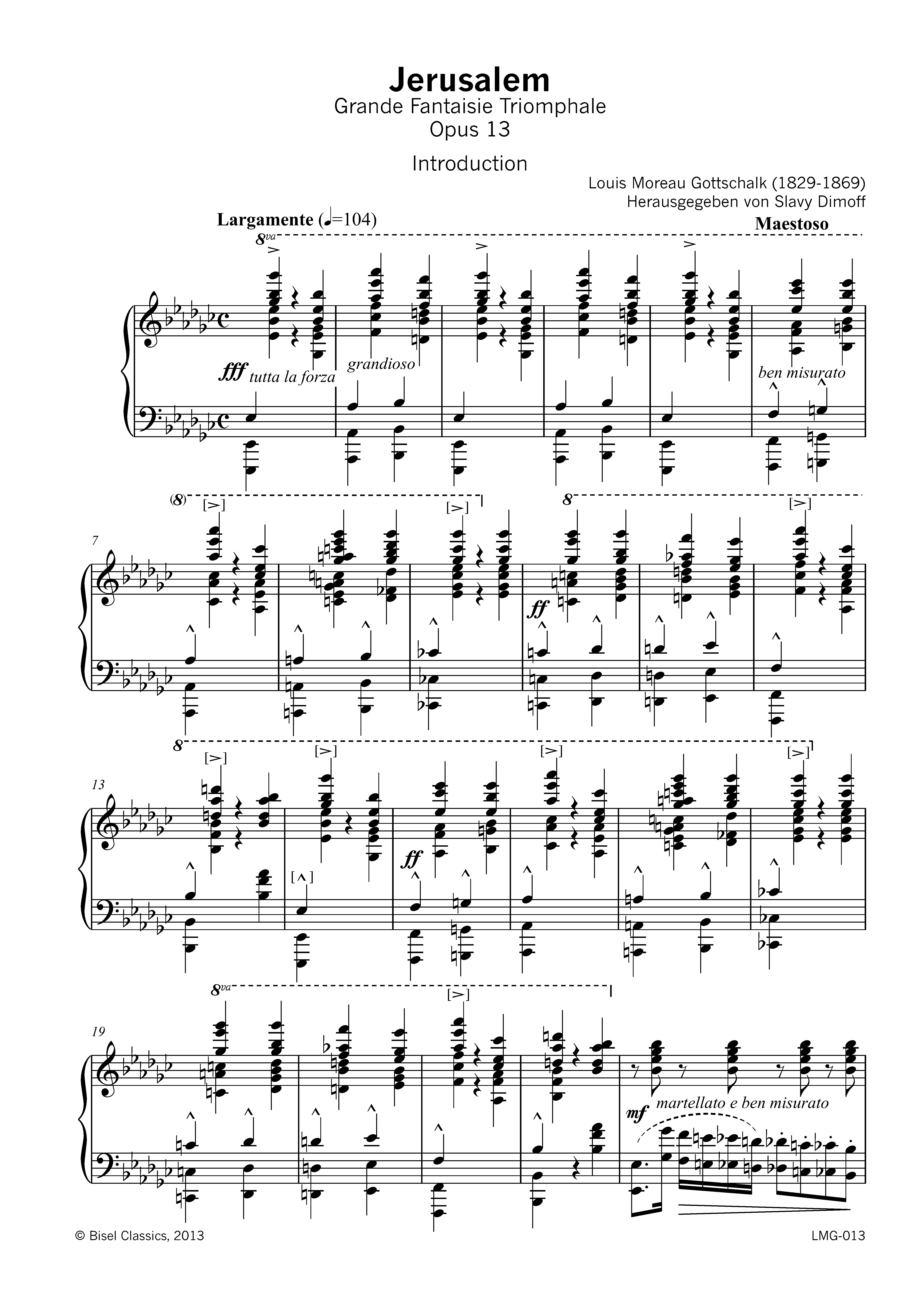 In his Fantaisie Op. 13 titled Jerusalem Gottschalk treated several themes from Verdis eponymous opera, which was immensely popular at the time. The technically demanding concert piece stands in line with the plethora of works that were performed in a similar style in the first half of the 19 century. It tells a story about the art of extemporization at the peak of its development, the art of virtuoso improvisation on any popular melody, which Gottschalk and his contemporaries Liszt and Thalberg mastered to perfection. Not only does the piece represent an attractive technical challenge, it also invites a reevaluation of the existing scheme of values regarding that admirable art, and is bound to enrich any romantically oriented concert performance.